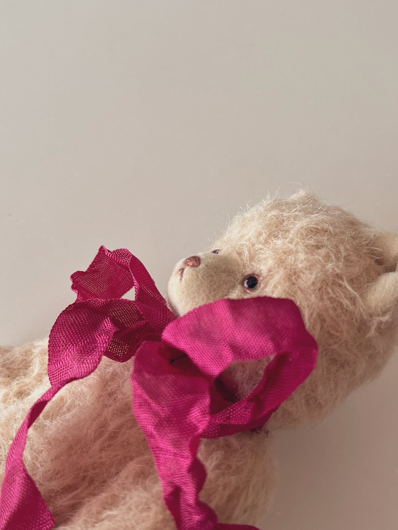 眸は薄いラベンダーの色で、ひかえめでやさしい表情のくまに仕上がっています。