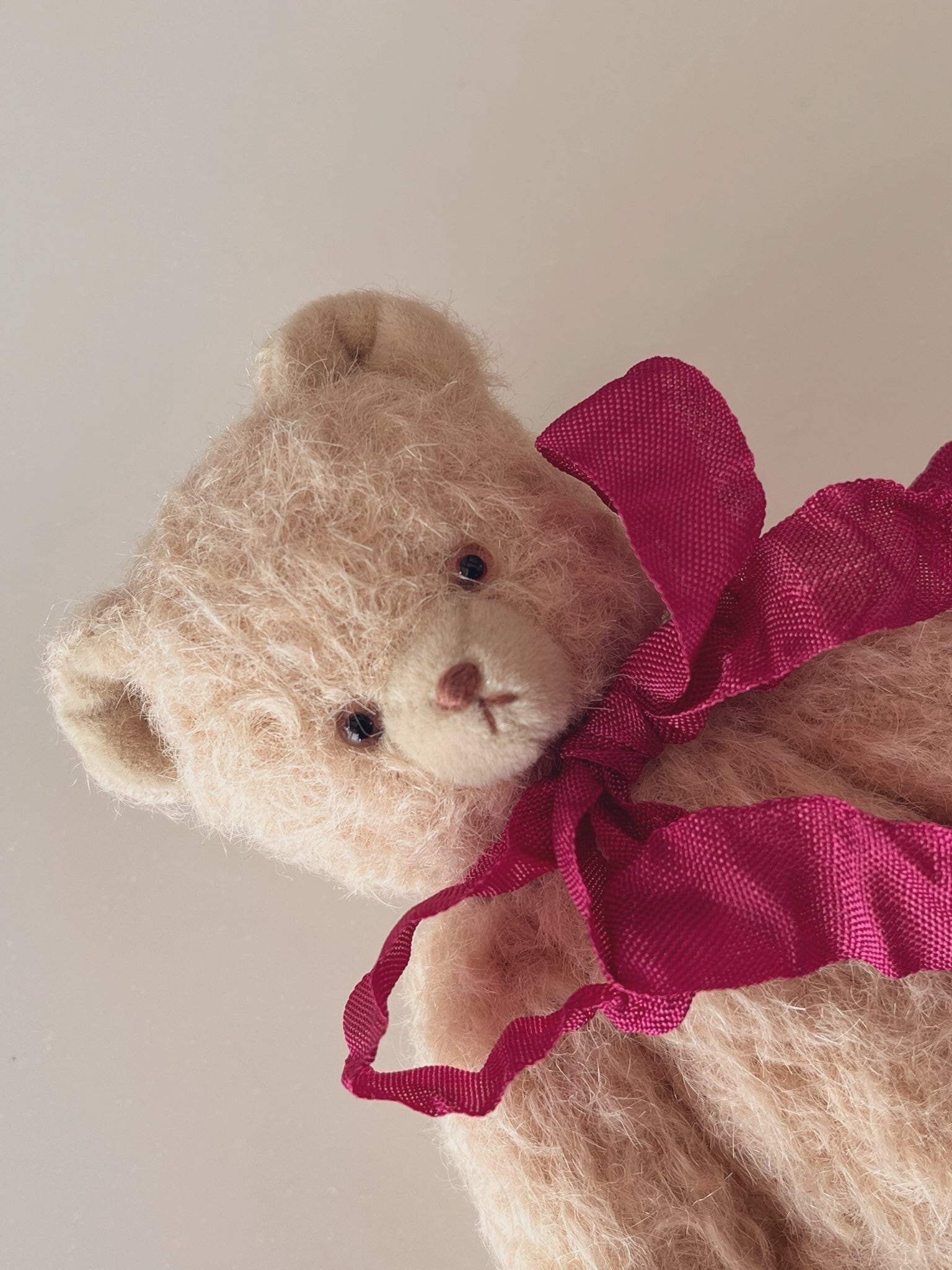 生地は基本的に新品のものを用いていますが、毛質、毛並みなどはアンティークの風合いに見えるものを選んでいますので、長い時間を経てきたテディベアのような落ち着いた雰囲気があります。