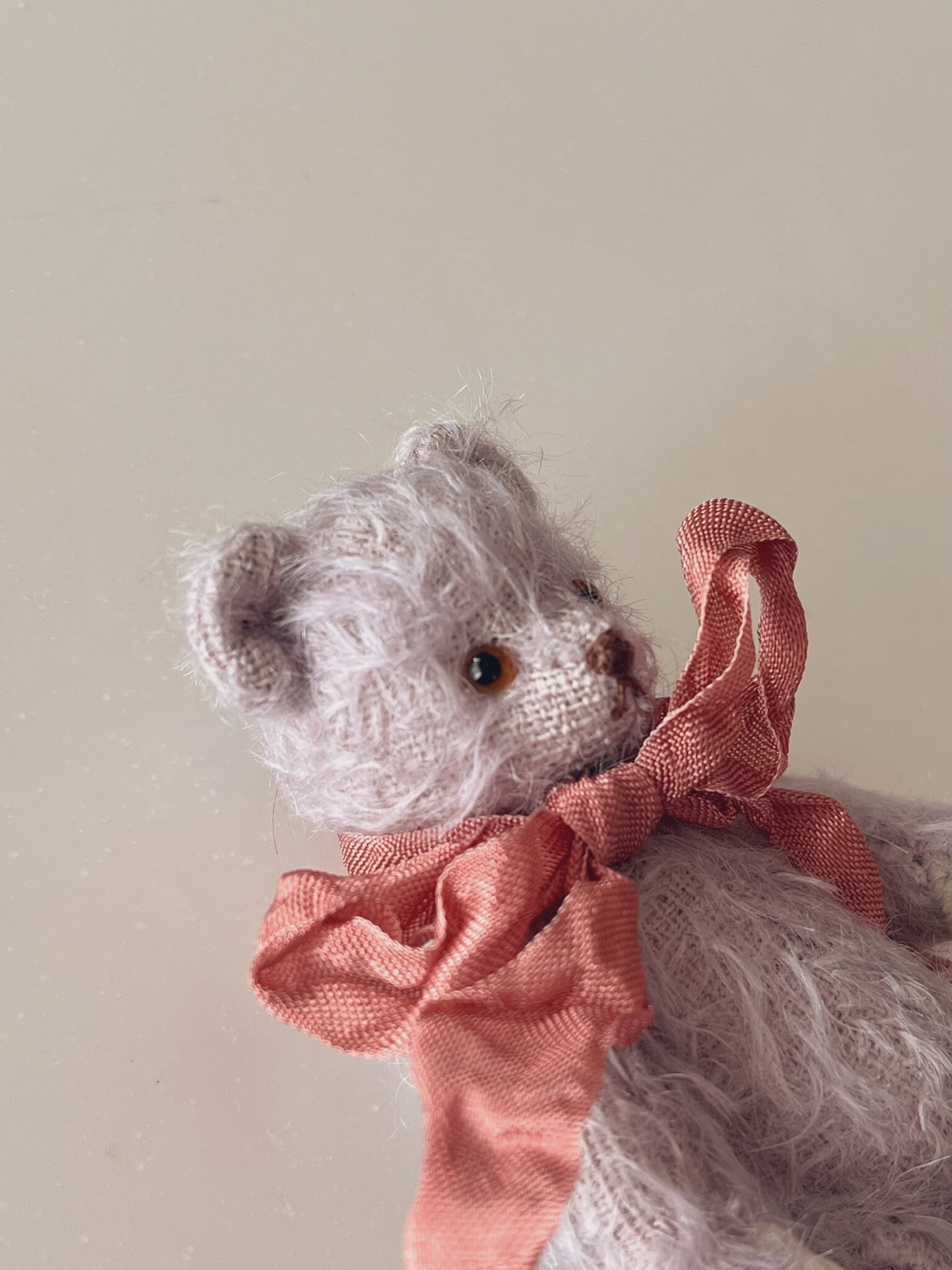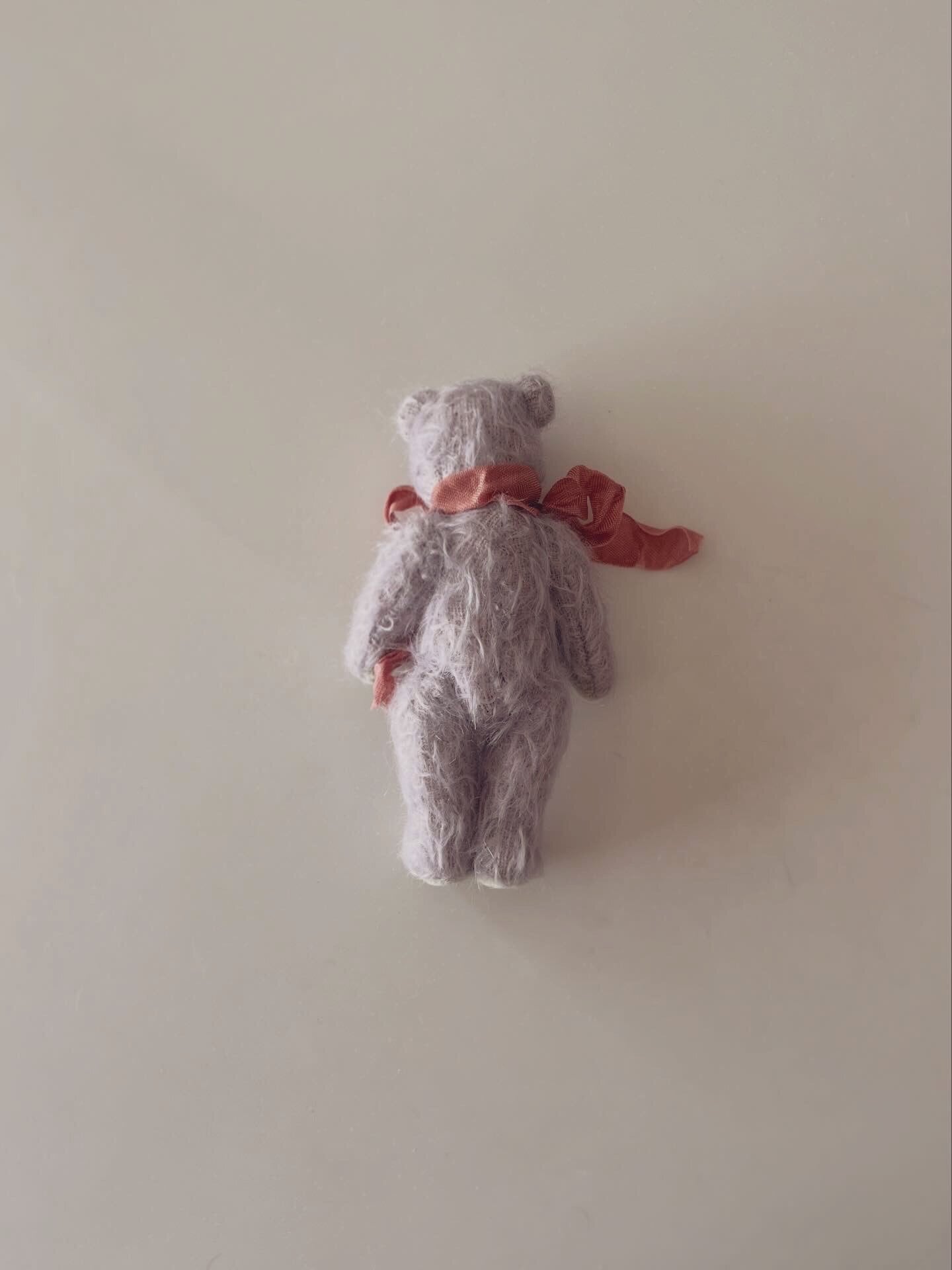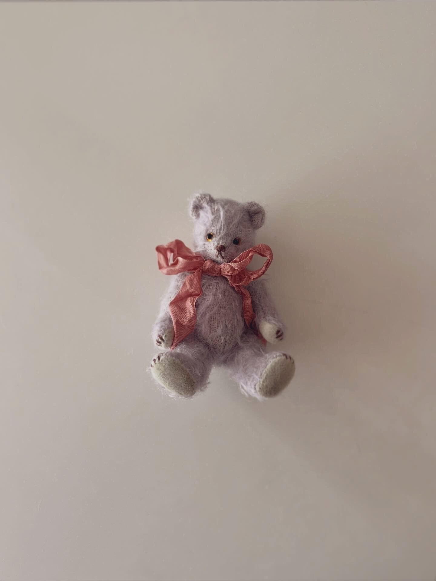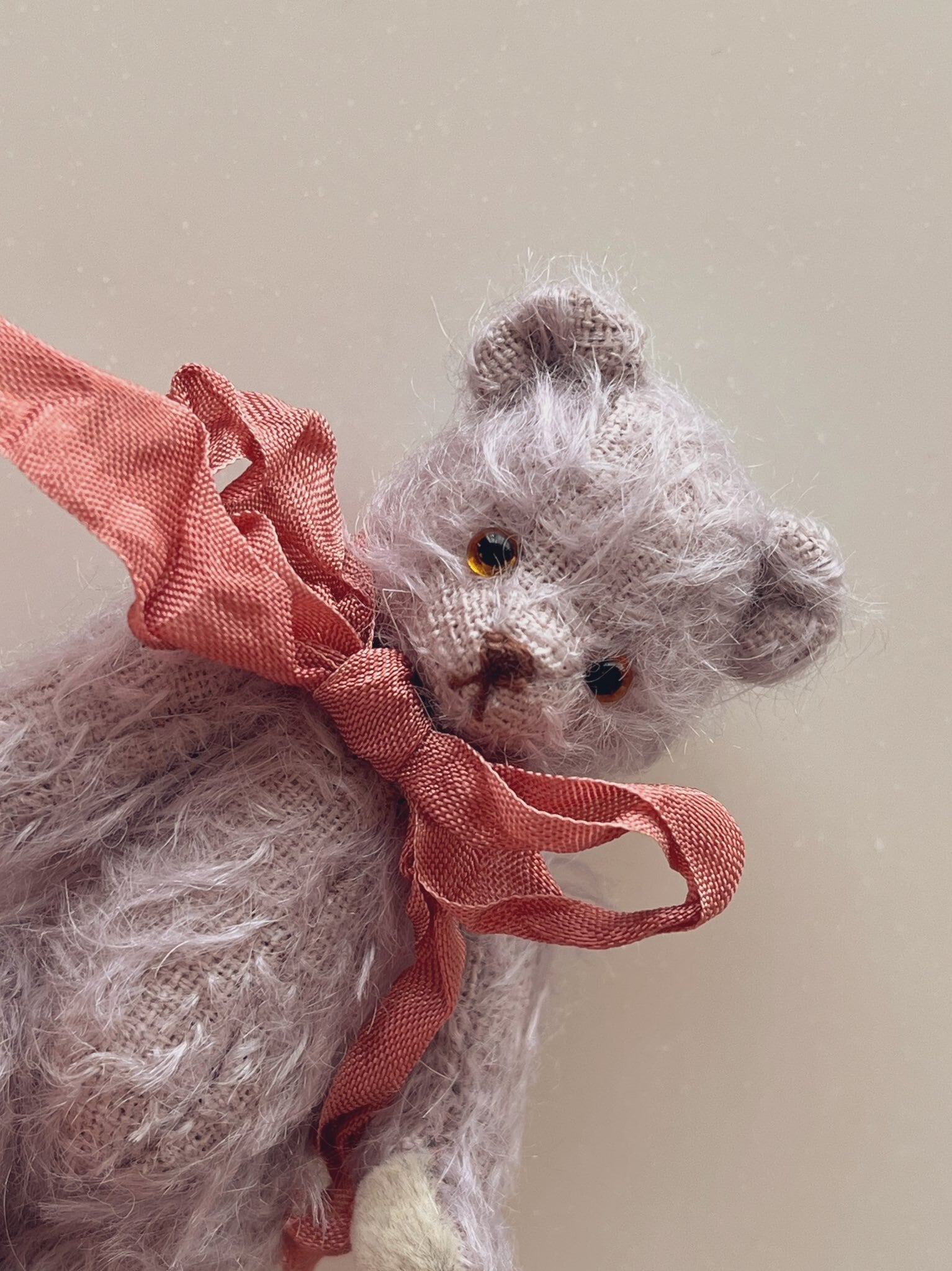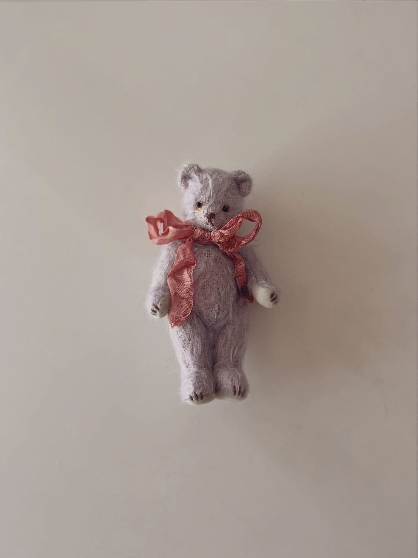 グレーがかったシックな薄紫のモヘアに、雪解け水のようなくすみ薄荷の手足のパッドを合わせました。春のお庭に一番最初に咲いた菫をイメージした色合わせです。